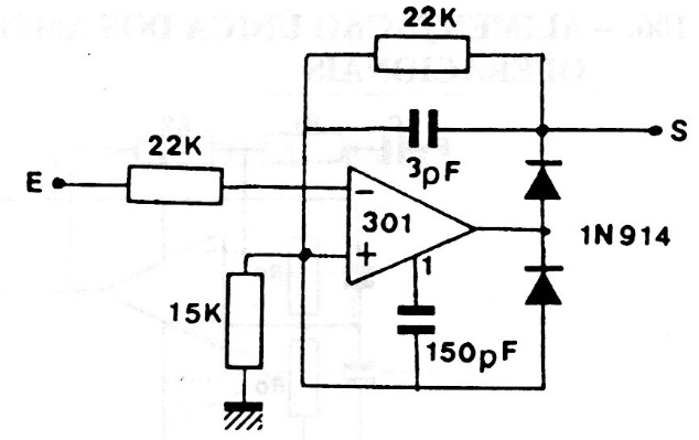 This circuit, unlike the previous one (CIR12983) has the values of the components. The operational admits equivalents, as well as the diodes that are general-purpose types. The circuit measures frequency compensation with the capacitor on pin 1.