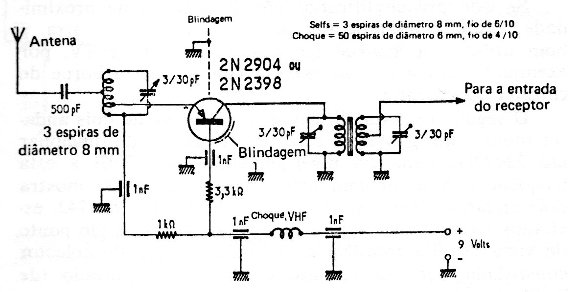 This circuit was originally indicated as a signal reinforcement step for the previous receiver (CB19598E) and others, but with small changes in the coil it can be used with FM receivers. The circuit is from the 70s with transistors of the time but can be changed to use modern transistors with higher gain.