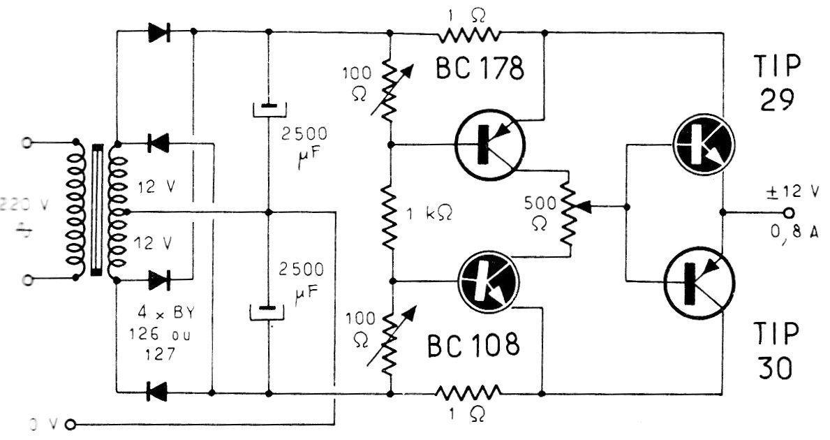 This circuit can provide both positive and negative voltage outputs from 2 to 12 V with current up to 800 mA. We found it in a European publication from the 1980s. The output transistors must be mounted on heatsinks and the diodes can be 1N4002 or 1N4004.