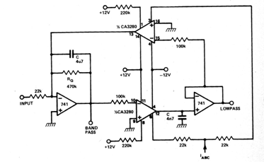 This circuit uses operational amplifiers that must be powered by a symmetrical source to implement a voltage-controlled filter. The circuit is from 1980 documentation and can be designed based on more modern equivalent operational amplifiers.