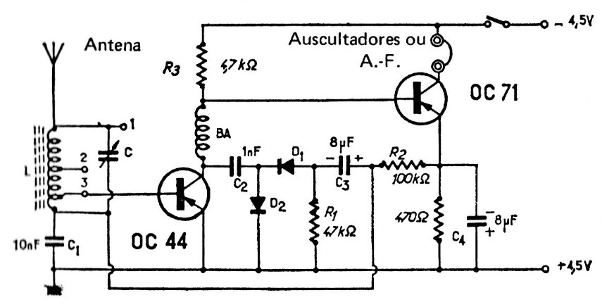 We found this circuit in a European publication from the 1970s. The transistors are made of germanium at the time and the high impedance magnetic phone. The antenna must be long and good ground is important. The coil is the same as the circuit (CB19592E). PNP germanium transistors of any type can be tested.