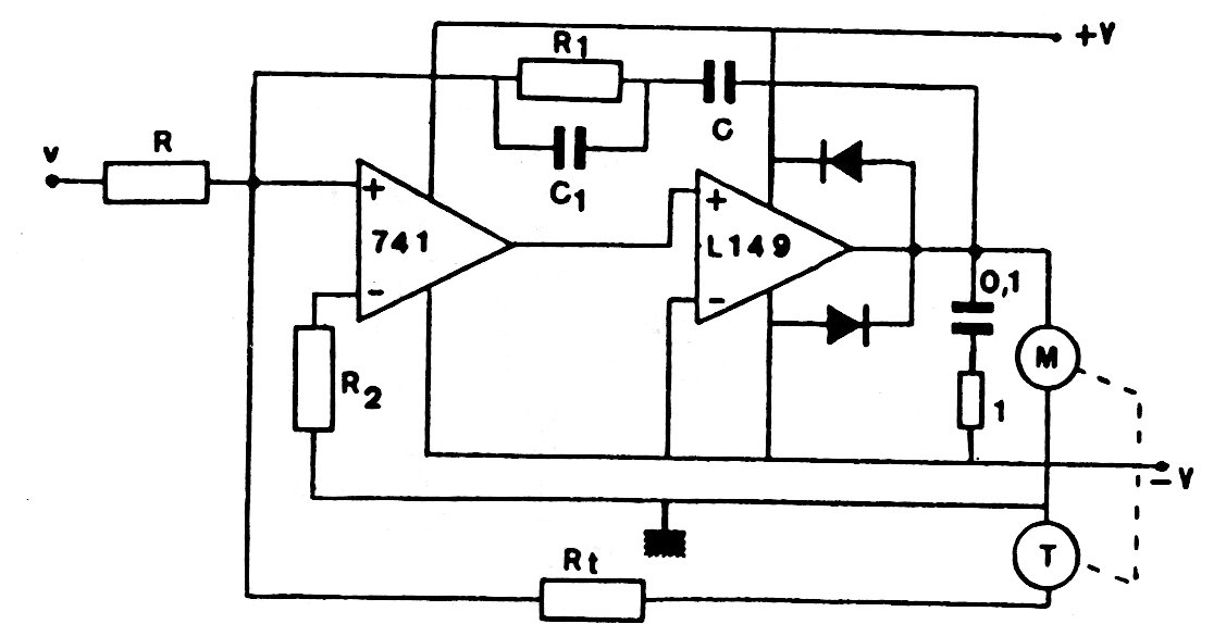 This control circuit for direct current motors uses a 741 and an operational one of unusual power today. The configuration can be adapted to use more modern components. The circuit is from old European documentation. Note that the power supply must be symmetrical.