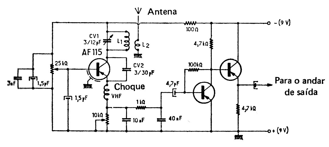 Taking advantage of the same basic configuration of the super-regenerative detector of the previous circuit (CB19596E), we have this tuner from the same period that applies the audio signal to a power amplifier stage or an external amplifier. The circuit is from the 70s and the transistors are germanium from that time.