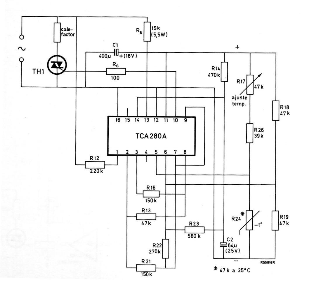This circuit is from a 1975 Miniwatts magazine, therefore using Philips components from that time, now difficult to find. The circuit directly controls a heating element via a Triac.