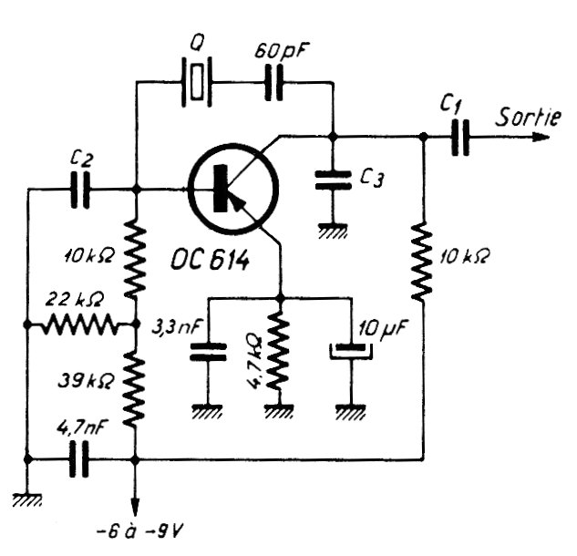This conventional oscillator can generate signals from 8 to 30 MHz depending on the crystal used. The transistor is from that time since the circuit is from the 80s. However, it can be implemented with current RF transistors, just inverting the polarity of the power supply.