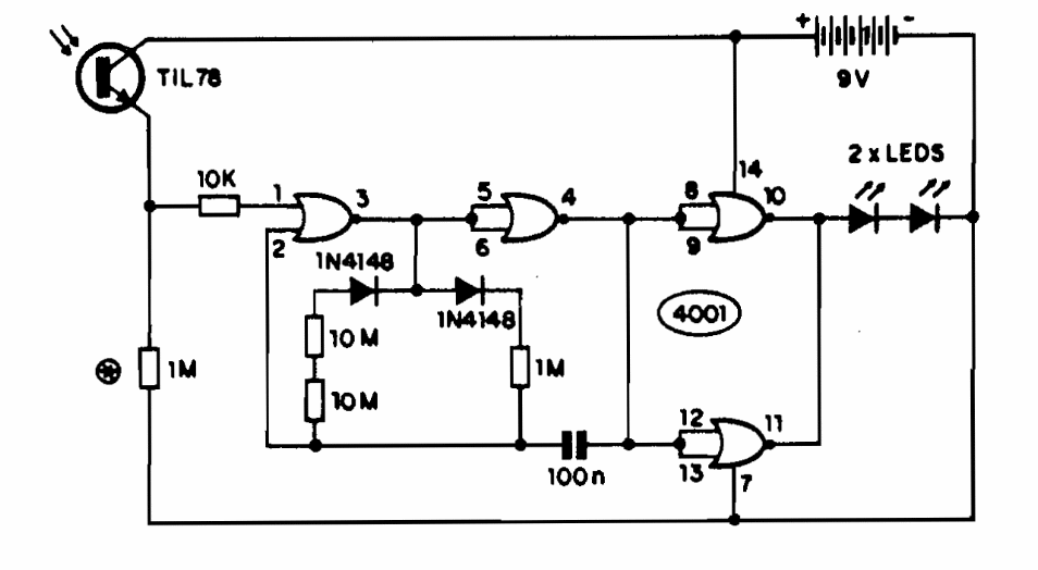We found this CMOS circuit in a publication from the 1980s. What this circuit does is to flash two LEDs at dusk, serving as a beacon or simply as decoration. The 9 V power supply can be made with a battery due to the low consumption.