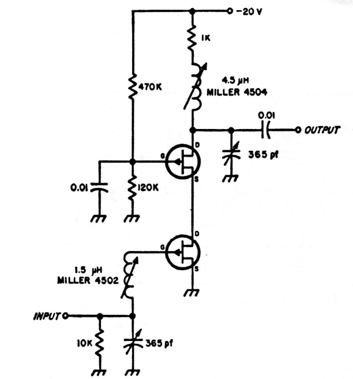 This intermediate frequency amplifier step using 2 junction FETs has a gain of 20 dB. The pass band is 4 MHz. FETs are for general use, with several types that serve in this circuit as BF245.