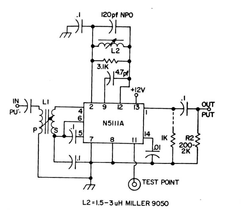 This circuit is based on an unusual component today. It demodulates a 10.7 MHz FI signal and was found in 1980s documentation.