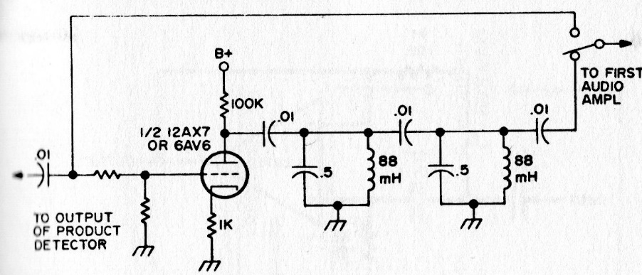 This tube circuit is from an 80's documentation. The filter is of the selective type and the components R and C determine the operation frequency. The voltage + B must be of the order of at least 150 V.