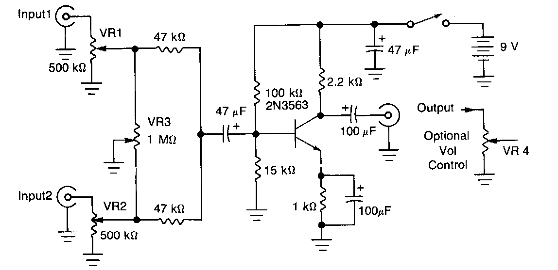 This version of a mixer with a transistor appears elsewhere in this section and on this website. The transistor can be a low noise BC548, and the source is a battery. This version is from an 80's American documentation.