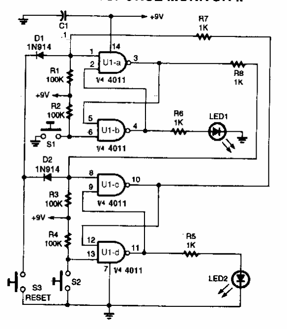 We found this game for two competitors in a Popular Electronics from the 80's. The circuit can be powered by voltages from 6 to 12 V.
