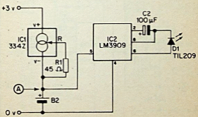 The battery is charged by the photocell that keeps the low consumption beacon in the dark. The beacon causes an LED to flash at a frequency given by C2.