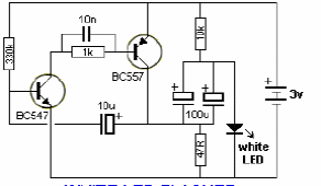 This circuit, found in American documentation, works as a voltage doubler, enabling the supply of a white LED from a 3 V button-type battery. The frequency is given by the 10 uF capacitor that can be changed.