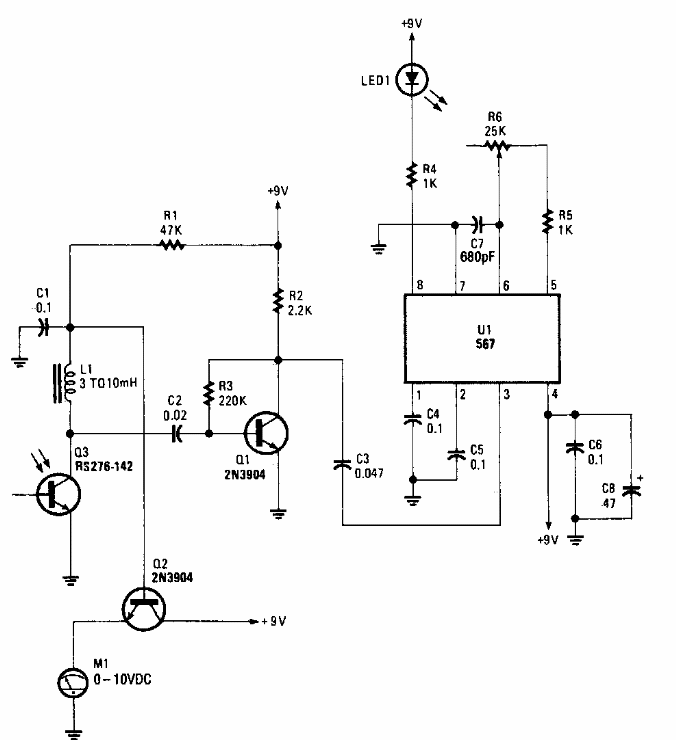 Found in Popular Electronics from the 90's, this tuned to infrared modulated receiver uses a PLL. The circuit has a signal strength indicator.