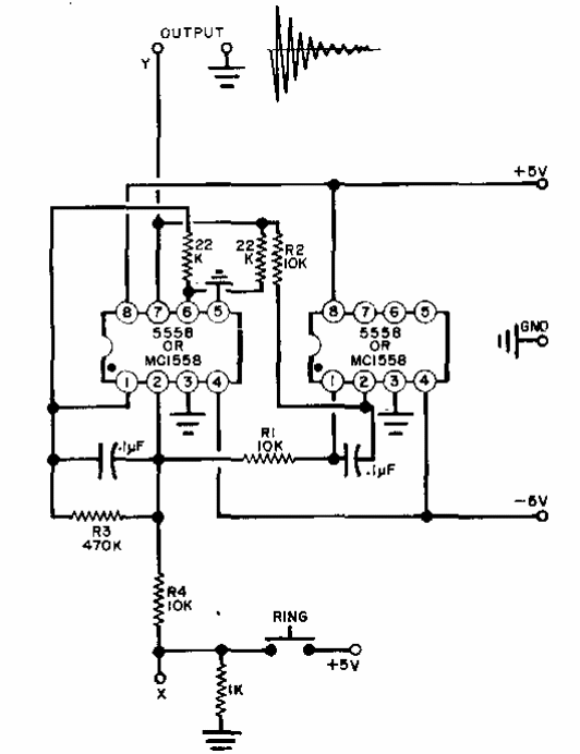 This circuit is from a Popular Electronics from the 80's. The components used are not common today. The circuit generates a damped signal that mimics a bell.
