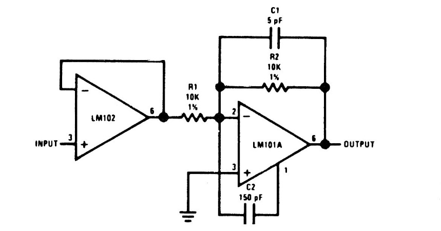 This fast inverter amplifier with high input impedance uses operational amplifiers from the 80's, the year of publication from which the circuit was removed. The circuit can be implemented with modern operationals and must be powered by a symmetrical source.