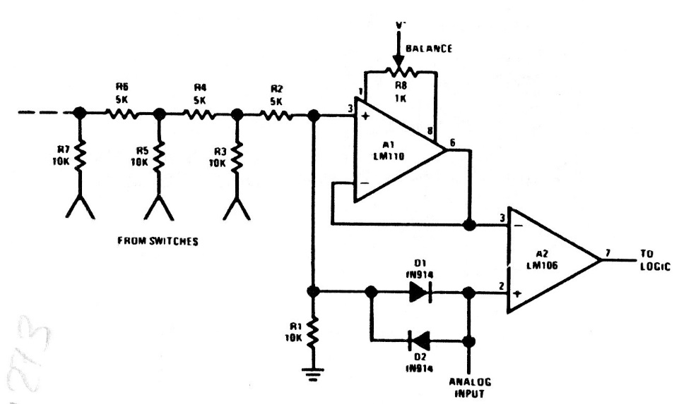 This other comparator configuration with AD using the R / 2R network is from factory documentation from the 1980s. The operational amplifier is no longer manufactured, but it can be adapted to make use of modern equivalent operational. The power supply must be symmetrical.