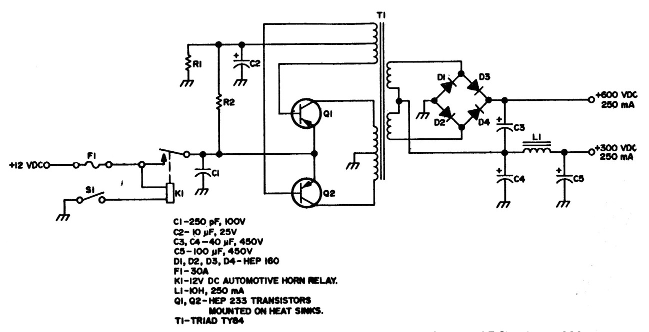 Originally this circuit was designed to power tube transceiver equipment in the car, using a 12 V battery. The circuit is from American documentation from the 1980s and the critical component is the transformer.