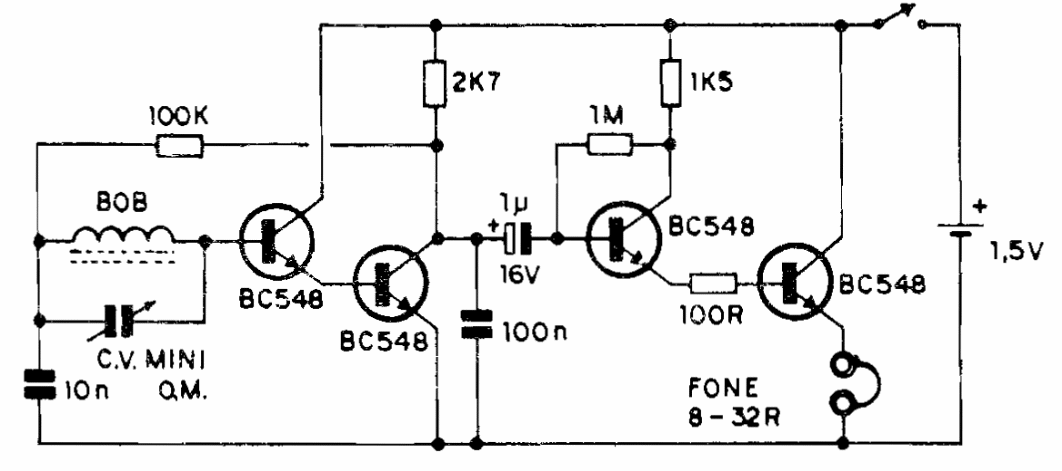 Indicated at the time of publication as a “walk man” for MW radios, this circuit is simple and can also be easily assembled. The coil consists of 80 to 100 turns of wire 26 or 28 in a small ferrite rod.