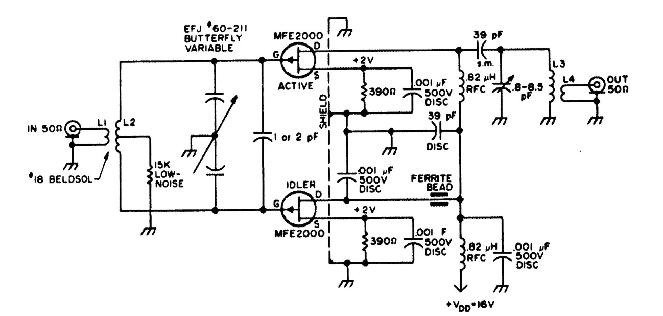 This circuit with junction field effect transistors was found in documentation from the 1980s. The transistors can be MPF102 or BF245 and details of the coils are not given in the original.