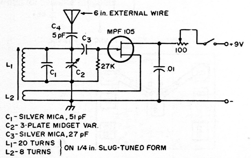 This small telegraph transmitter has a range of a few meters, operating at a frequency that depends on the coils. The FET can be of any type and the power is provided by a 9 V battery. In this case, the band is short wave.