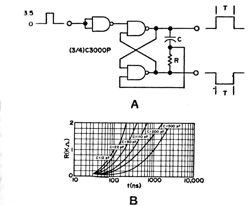 We found this configuration with a logic circuit that is now uncommon in an 80's documentation. The circuit can be implemented today with modern logic. The graph shows its behavior as a function of R and C.