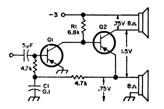 This interesting configuration uses two speakers as a load to have a push-pull excitation with only one transistor. The circuit is small in power, according to the transistor.
