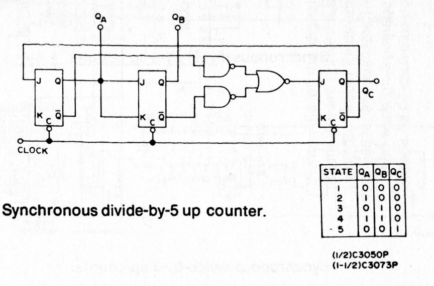 This dividing circuit can be implemented with either TTL or CMOS logic, using the appropriate logic functions. Power depends on the application.