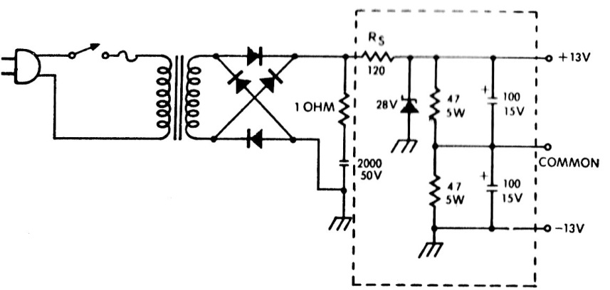 This 12 V symmetrical power supply provides a current of the order of 100 mA according to the transformer used. The diodes can be 1N4002 and the zener can be 1 W. Observe the dissipation of the resistors.