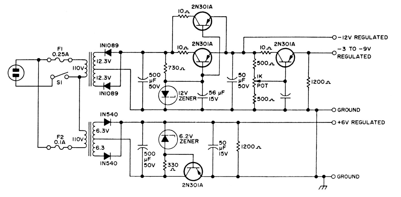 This multiple power source, with two transformers was found in American documentation from the 1980s. Power transistors have equivalents and must be equipped with good heat sinks. The transformers are according to the voltages and currents of each sector.