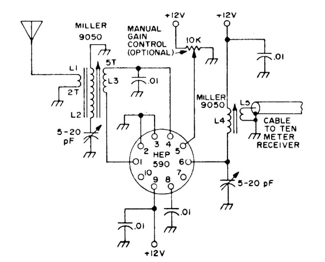 We found this preamplifier for the 10 and 11-meter range in an old documentation for radio amateurs. The integrated circuit used is uncommon today.