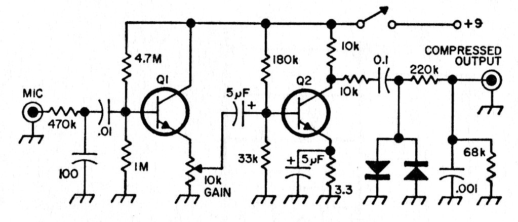 This circuit from an old documentation (1970s) combines the function of cutting or limiting the intensity of an audio signal, avoiding the saturation of the circuit and also operates as a good gain amplifier. The transistors can be the BC548.