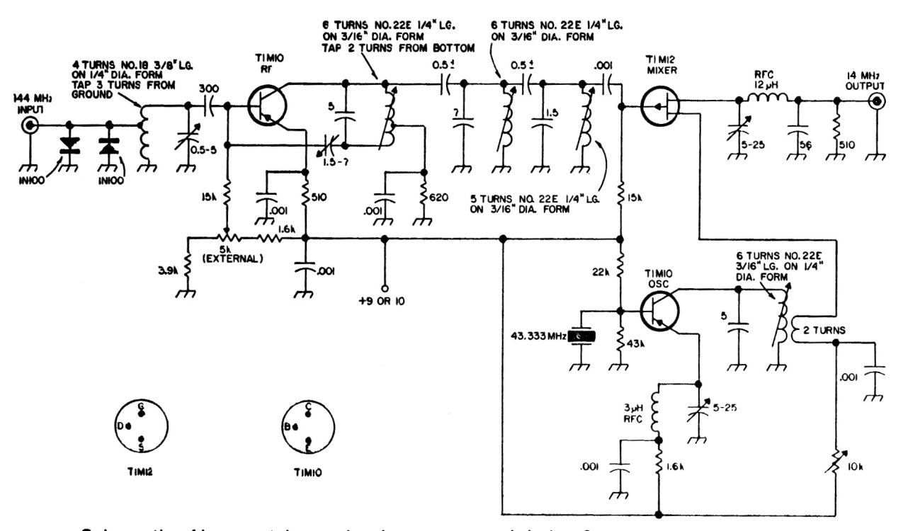This converter for the 150 MHz band was found in an American documentation. Transistors are uncommon today and equivalents can be used.