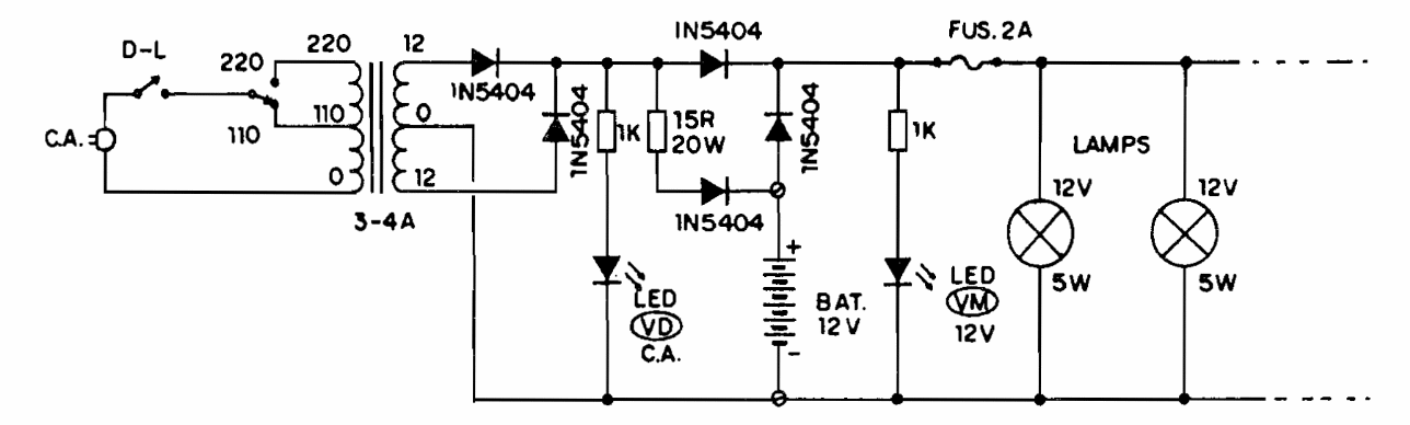 This circuit keeps a set of lamps permanently on, even when there is a power cut. The circuit can be adapted to use LEDs and the 12 V battery can also be changed according to the lamps or LEDs.