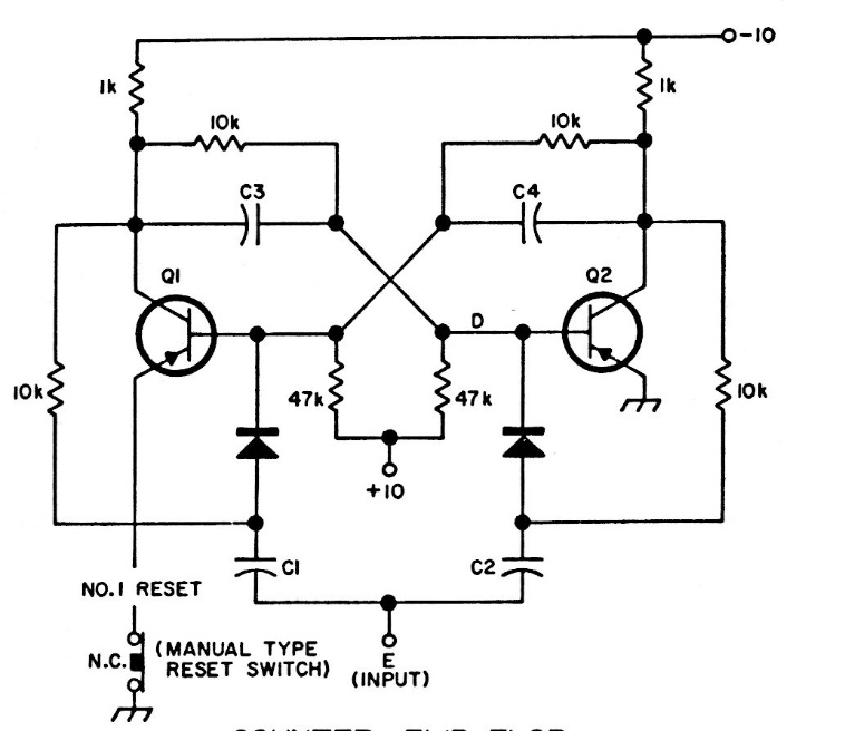 This flip-flop circuit with general purpose transistors was found in American documentation from the 1980s. The maximum operating speed depends on the transistors. Diodes are commonly used.