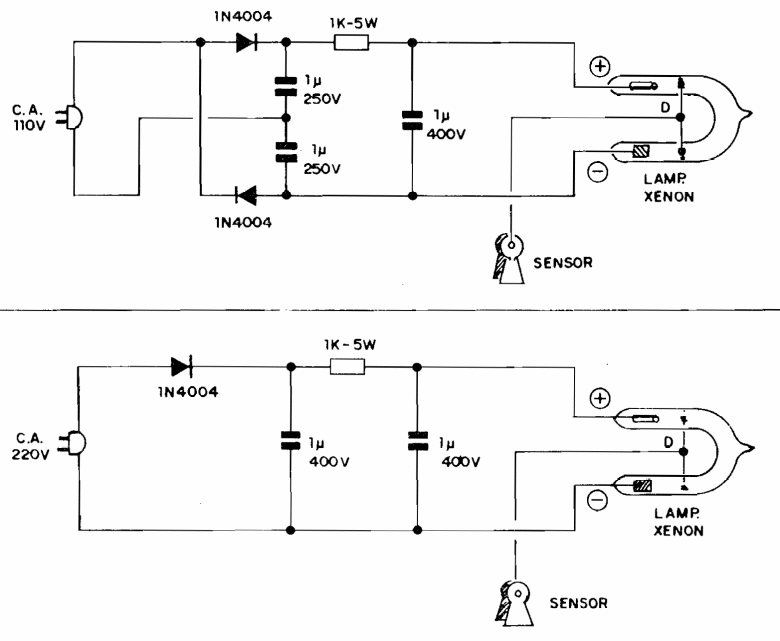 These two point-light circuits for cars with platinum were found in an old national documentation. The circuit has versions for 110 V and 220 V and has a sensor that is connected to the car's high voltage distributor.