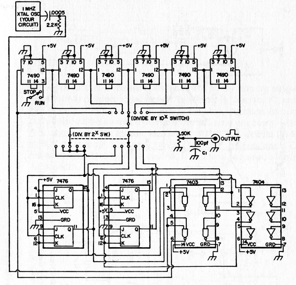 This pattern of TTL frequencies was found in an 80s manual. The circuit must be powered by 5 V and is compatible with current microcontrollers. Accuracy depends on the input oscillator, which should preferably use crystal.