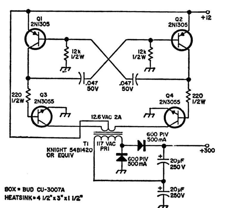 This inverter circuit with transistors provides a voltage of 300 V from a 12 V supply. The current, with the original transistors, is only 55 mA. Transistors must be mounted on heatsinks.