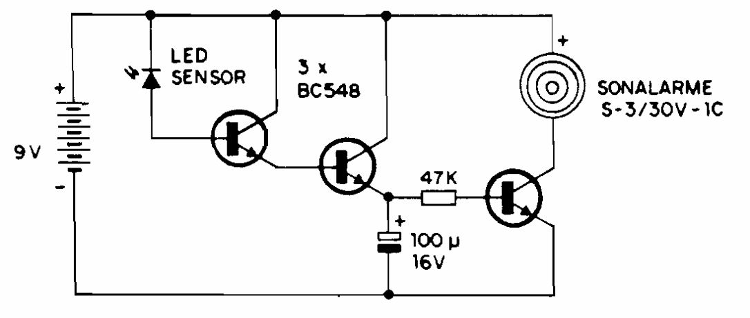 This circuit triggers a Sonalarme when the LED used as a sensor receives light. The circuit was found in an old documentation, but the components used are all current.