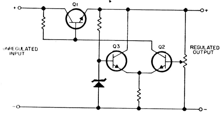 In the figure we have the configuration of a voltage regulator with 3 transistors. The components depend on the desired voltage and current as well as on the characteristics of the transistors.