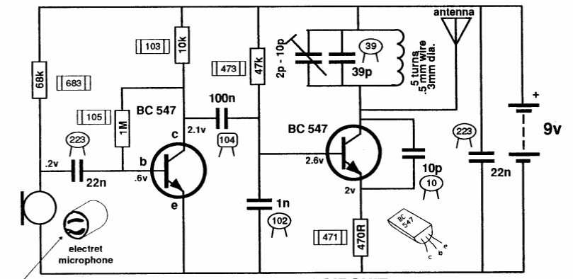 In fact, the original American publication exaggerated a little about the range that a good receiver requires and that for open field operation. This small FM transmitter uses a 40 to 80 cm antenna and is powered by a 9 V battery.