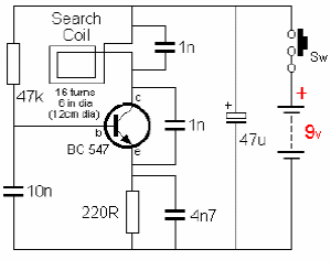We have several circuits like this on the website. What it does is generate a signal in the range of medium waves, captured in a radio placed near the explorer coil. When a metal enters the coil field, the frequency changes, and this is perceived in the receiver. The coil consists of 16 coils of common wire or enameled in a flat plastic form of 12 cm in diameter.
