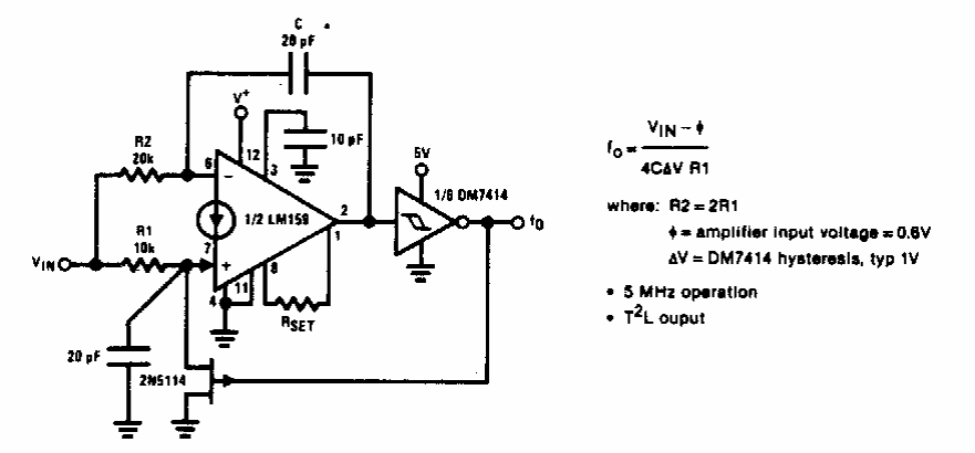 This circuit makes use of a transconductance operational amplifier from the 90s. Formula for the calculation of the components is given next to the diagram.