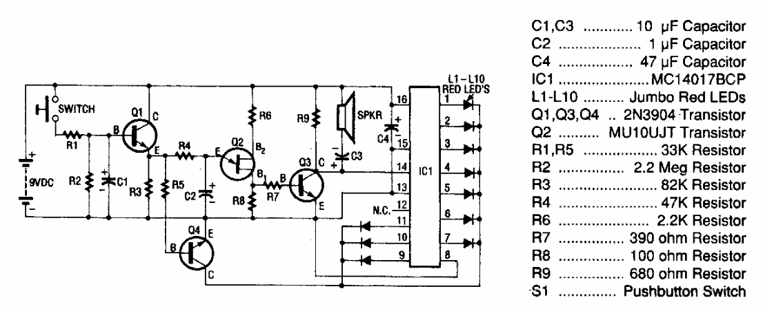 This electronic roulette circuit with 10 numbers was found in a Popular Electronics from the 80s. The circuit uses indicator LEDs and the transistors are general purpose.