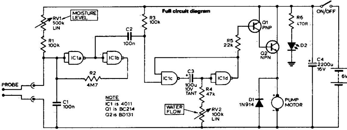 This circuit triggers a small water pump when the humidity detected by the sensor is reduced in a flower bed or potted plant. The circuit must use a source according to the driven water pump.