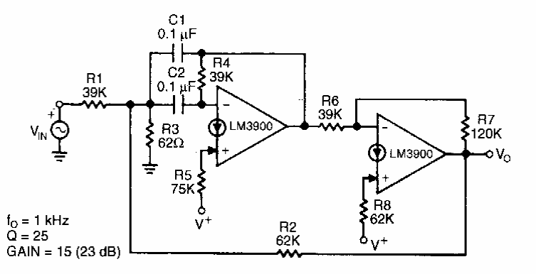 This circuit makes use of two transconductance operators. We found it in National Semiconductor documentation from the 1980s.