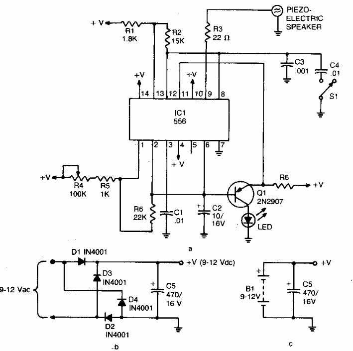 This sophisticated repellent uses a double 555. We find it in an American documentation from the 80's. The circuit can be powered by batteries or source included in the diagram.