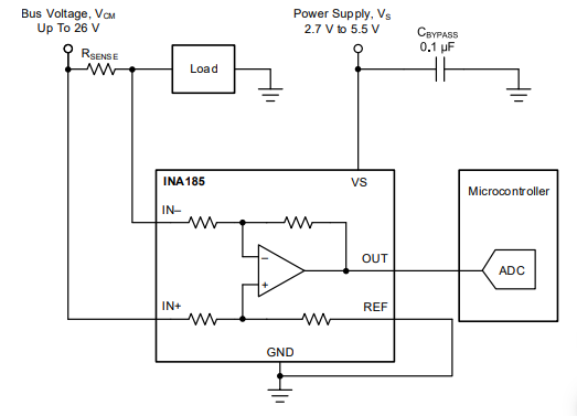 The INA185 integrated circuit from Texas Instruments is a current sensor that can operate with voltages from 2.7 to 5.5 V. In the figure we have a typical circuit of the datasheet used to interface a current sensor with a microcontroller. (2019)