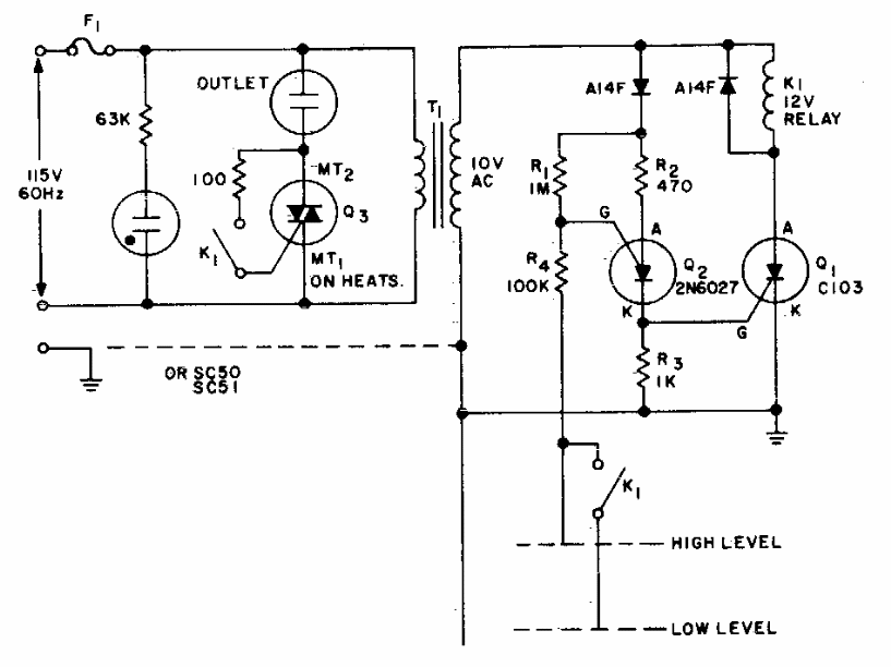 Found in old documentation, this circuit has only the most difficult component to obtain the PUT. The sensors are electrodes placed in the reservoir. The circuit directly controls an AC power load.