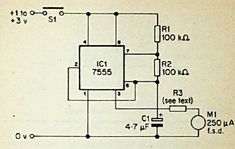 This circuit causes an instrument needle to oscillate to signal an event. The circuit is powered by solar panel from 1 V.